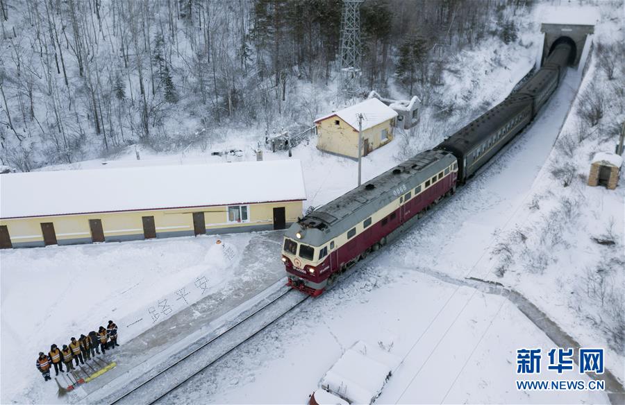 1月7日,西羅奇維修工隊工作人員在雪地上寫下“一路平安”為經過的列車旅客送上祝福(無人機照片)。新華社記者王毓國攝