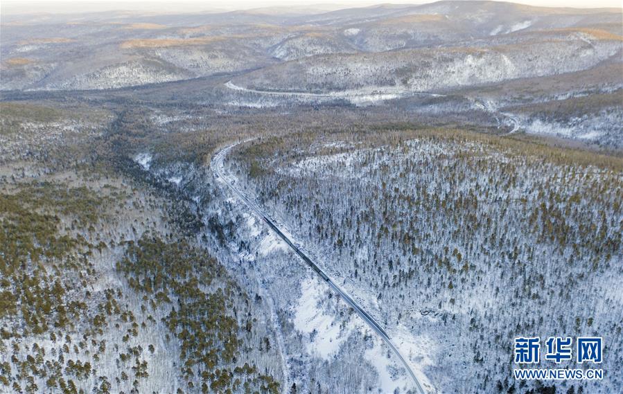 1月6日,一輛列車穿行在西羅奇維修工隊管區的林海雪原上(無人機照片)。新華社記者才揚攝