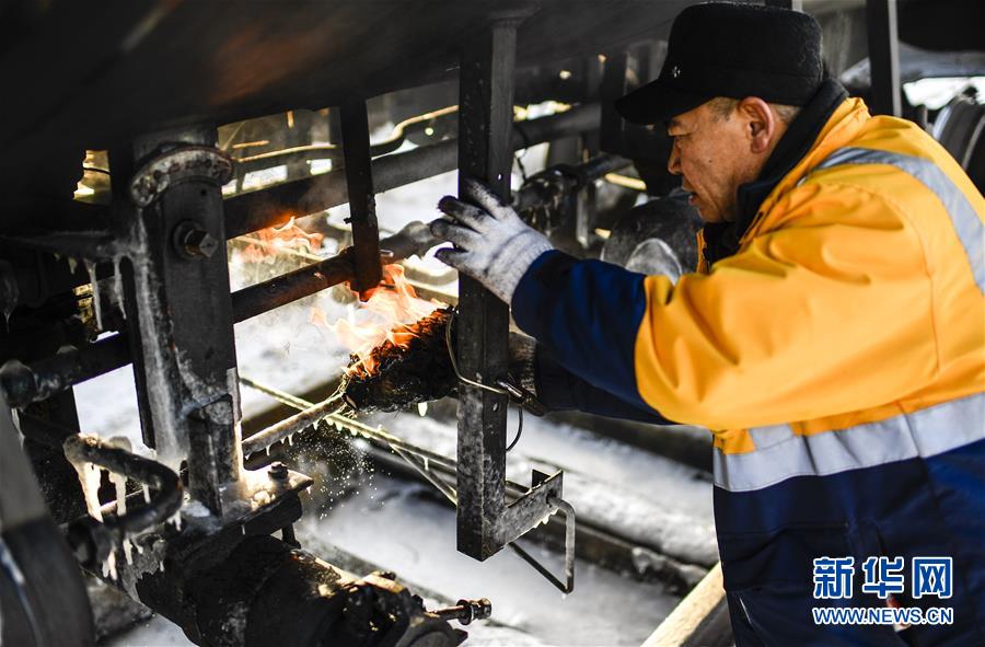 因為冬季溫度過低,送水員黃衛東在蓄水前需要提前加熱閥門(1月17日攝)。新華社記者 許暢 攝