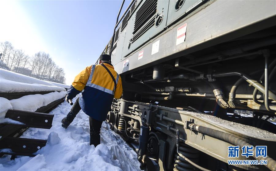送水員黃衛東在雪地中前行,準備登上火車前往送水地點(1月17日攝)。新華社記者 許暢 攝