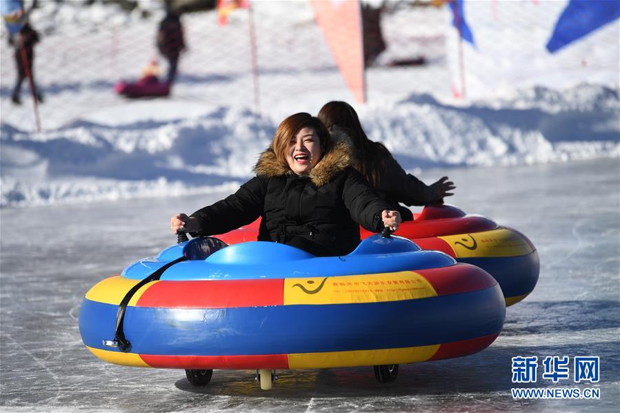 1月18日,游客在新疆天池景區玩電動碰碰車。新華社記者 沙達提 攝