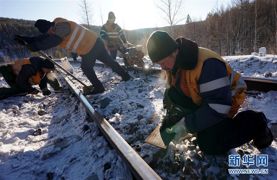 1月8日,西羅奇維修工隊工作人員在嫩林線497公里處進行維修作業。新華社記者王毓國攝