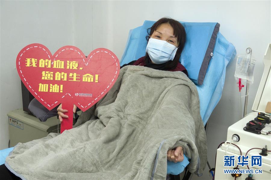在武漢血液中心的中國醫學科學院CPnCoV項目組,康復病人、來自漢口醫院的護士蔡桃英在獻血漿時拍照留念。她說同事們都在一線忙碌,她獻血漿后,再休息幾天就準備回到崗位上班,她說自己感染是由于早期防護不足經驗不夠造成的,再次回到工作崗位一定沒有問題(2月17日攝)。 新華社記者 才揚 攝