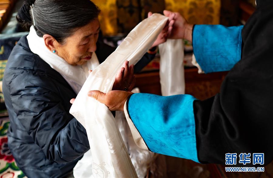 一名藏族群眾給長輩敬獻哈達,祝福長壽(2月24日攝)。新華社記者普布扎西攝