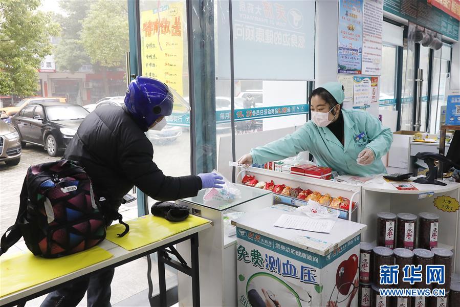 2月22日,王春波將藥品遞給前來買藥的外賣騎手。王春波是武昌天濟大藥房錦繡江南店的一名店員,在武漢下達“所有小區全面實施封閉管理”的禁令之后,很多居民買藥成了麻煩事,尤其是獨居的老年人。她知道后,主動聯系物業告知大家,如果有需要,她可以上門送藥?,F在,她和同事每天要派送100多單藥品,大部分都是“三高人群”服用的藥。很多顧客很感激王春波,“幸虧你們一直開業,東西也齊全,一分錢都沒漲!”王春波說:“關鍵時期,大家都是在相互幫忙,這就是很平常、很普通的一件事?!毙氯A社記者熊琦攝