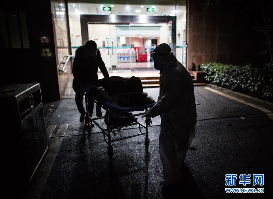 2月29日凌晨,王震(右一)協助將產婦劉婷送至CT室做產前檢查。新華社記者 肖藝九 攝