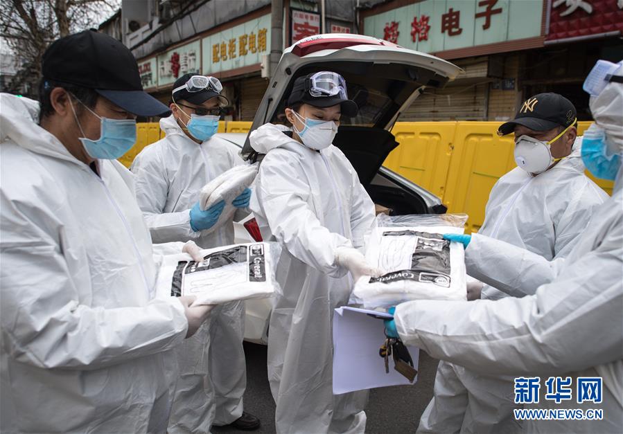 2月29日,W大武漢緊急救援隊隊長王紫懿(中)為隊員發放防護服。她說,現在防護物資十分緊缺,隊員們都在省著用,希望能撐到疫情結束。新華社記者 肖藝九 攝