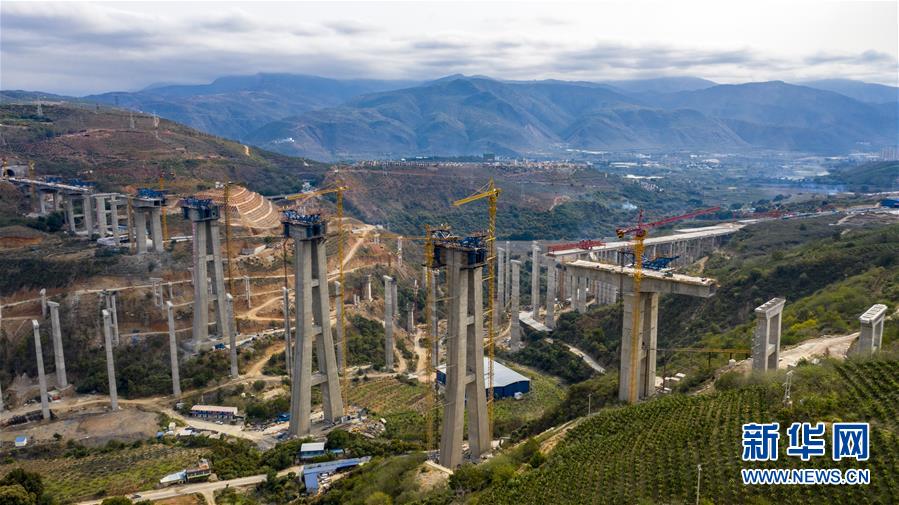 這是3月5日拍攝的中老鐵路南溪河特大橋橫跨在建高速公路(無人機照片)。近期,中老鐵路玉溪至磨憨段有序復工復產,由中鐵四局承建的中老鐵路全線重點控制性工程——元江特大橋、南溪河特大橋正在加緊施工建設。新華社記者 江文耀 攝