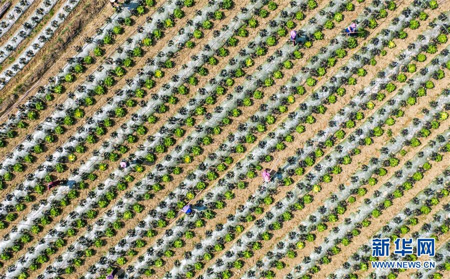 3月8日,貴州省羅甸縣龍坪鎮羅化村村民在田地里勞作(無人機照片)。