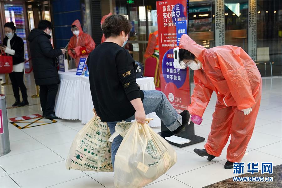 3月13日,在哈爾濱香坊萬達廣場內,工作人員在給進店顧客消毒。 近日,哈爾濱市多家大型商場陸續恢復營業。這些恢復營業的商場采取多種措施,從嚴細致做好疫情防控和安全風險防范工作,為廣大顧客提供安全放心的購物空間。 新華社記者 王建威 攝