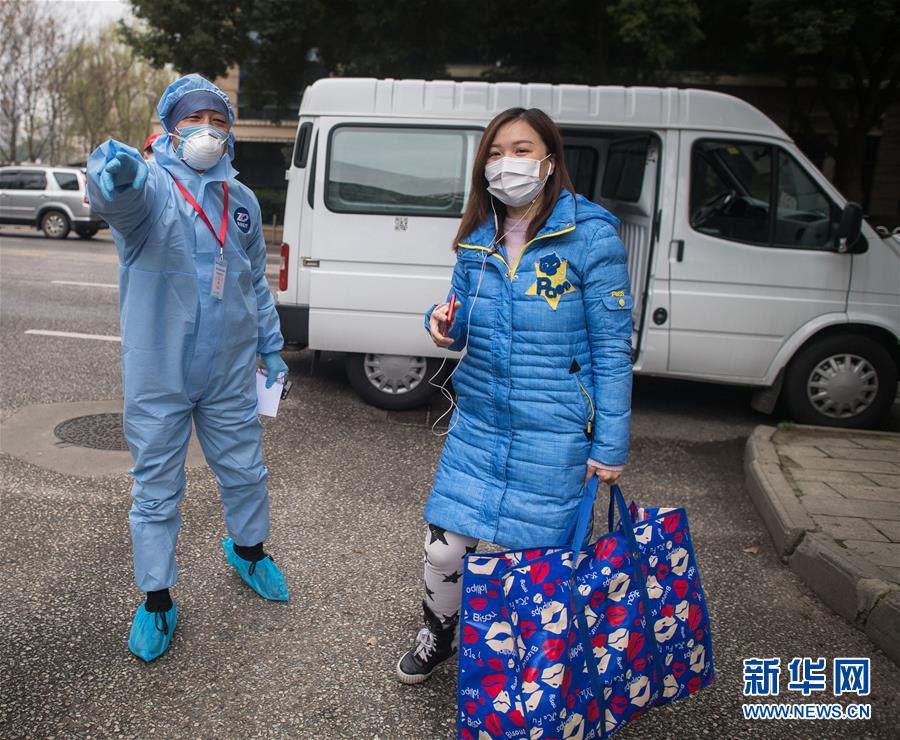 3月12日,黎婧(右)到達小區后激動不已。 3月12日,插畫師黎婧和84位病友離開自己居住的武漢軟件工程職業學院康復驛站,回到自己家中。他們都是治愈出院的新冠病毒肺炎患者,已經在武漢軟件工程職業學院康復驛站進行了14天醫學觀察,達到醫學標準,成功解除隔離。他們由專車運送至所屬社區附近的集散點后,在社區工作人員的陪同下回家。 新華社記者 肖藝九 攝