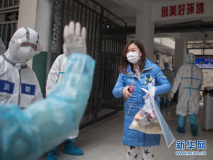3月12日,現場的工作人員與黎婧揮手告別。 3月12日,插畫師黎婧和84位病友離開自己居住的武漢軟件工程職業學院康復驛站,回到自己家中。他們都是治愈出院的新冠病毒肺炎患者,已經在武漢軟件工程職業學院康復驛站進行了14天醫學觀察,達到醫學標準,成功解除隔離。他們由專車運送至所屬社區附近的集散點后,在社區工作人員的陪同下回家。 新華社記者 肖藝九 攝