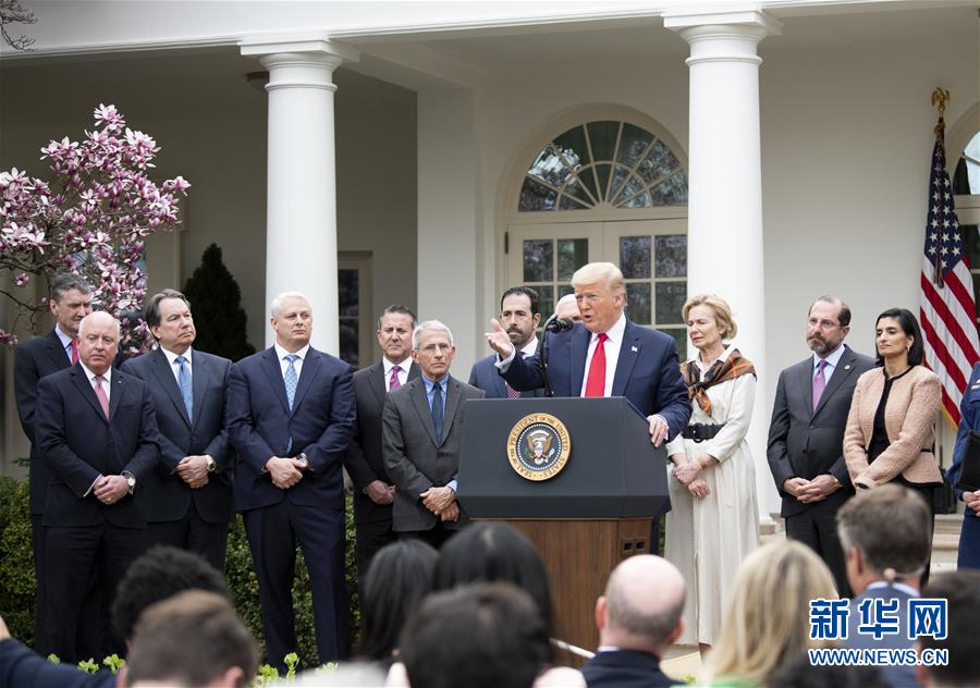 3月13日,美國總統特朗普(中)在華盛頓白宮的記者會上講話。特朗普當天下午在白宮發表講話時正式宣布“國家緊急狀態”。他說,此舉旨在讓美國聯邦政府全力投入到抗擊新冠肺炎疫情的努力中。這項舉措將釋放500億美元資金,幫助各州和地方政府應對疫情。新華社記者劉杰攝