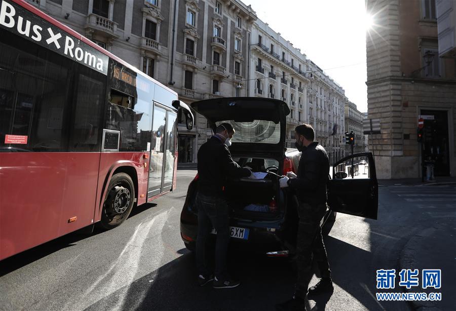 3月16日,在意大利首都羅馬,兩名便衣警察查驗人們出行的“自我聲明”以及身份證件。新華社記者程婷婷攝