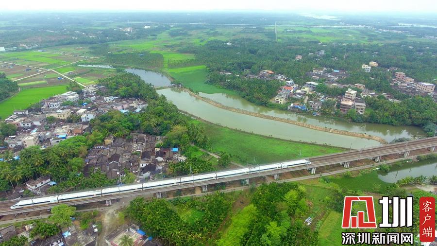 2020年3月17日,海南環島鐵路一列動車從春光明媚的瓊海城區經過。