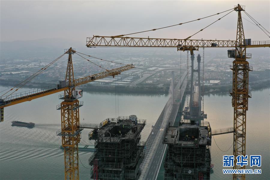 3月18日,施工人員在廣州南沙港鐵路跨西江斜拉橋東主塔進行封頂施工(無人機照片)。新華社記者劉大偉攝