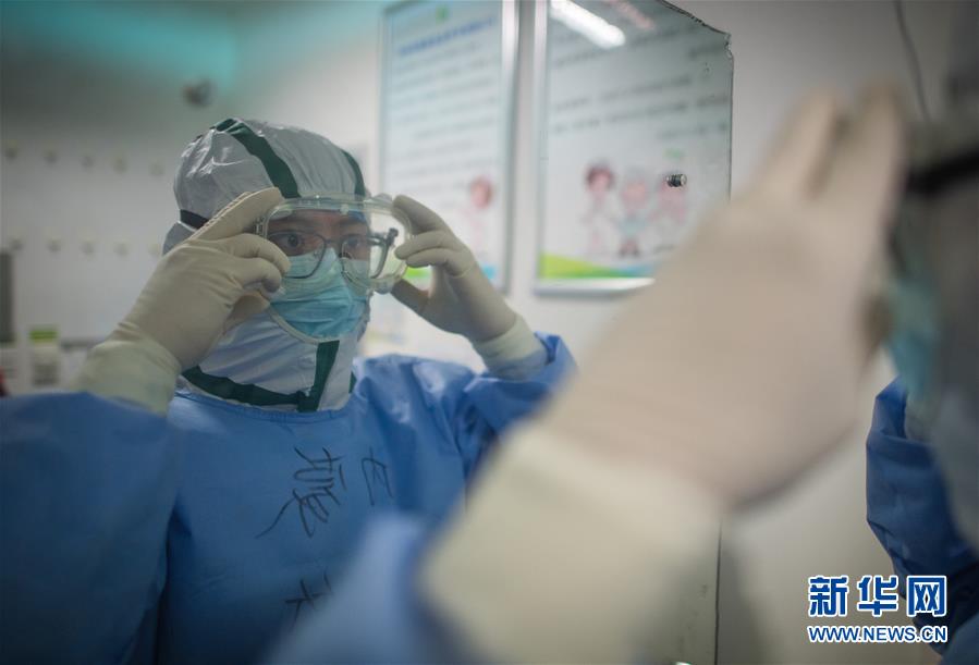 3月19日,在武漢市肺科醫院清潔區,內蒙古醫療隊隊員在穿戴護目鏡。 新華社記者 肖藝九 攝
