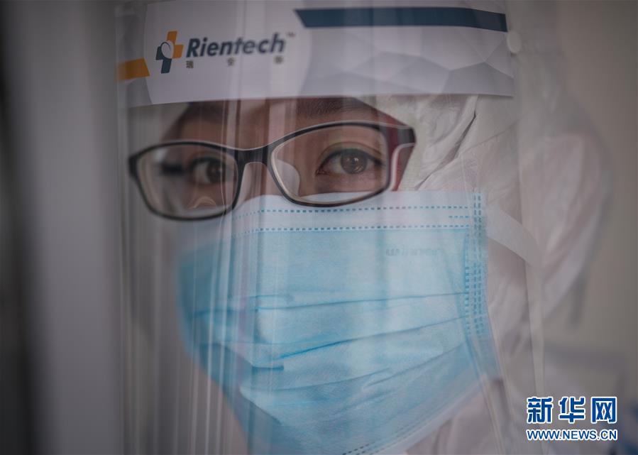 3月19日,在武漢市肺科醫院隔離病房,內蒙古醫療隊隊員在工作中。 新華社記者 肖藝九 攝