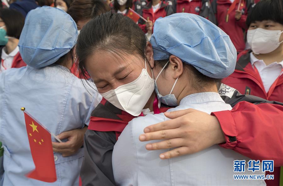 3月21日,武漢市第一醫院的醫護人員(前)與天津市醫療隊隊員李梅擁抱道別。新華社記者費茂華攝