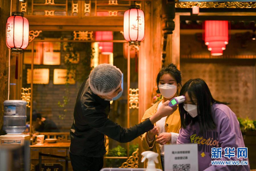 3月21日,在四川省成都市的一家火鍋店門口,顧客在登記信息,接受體溫檢測。近日,在做好新冠肺炎疫情防控措施的基礎上,四川省成都市的火鍋店逐漸恢復營業。新華社記者唐文豪攝