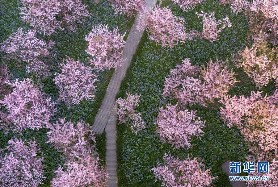 這是3月14日拍攝的武漢東湖磨山櫻園景色(無人機照片)。近日氣溫漸升,武漢東湖磨山櫻園里的櫻花漸次盛開,帶來春天的氣息。新華社記者熊琦攝