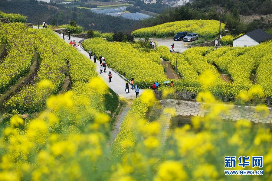 3月25日,游客在新登鎮上旺村黑山頂的油菜花海中游覽。