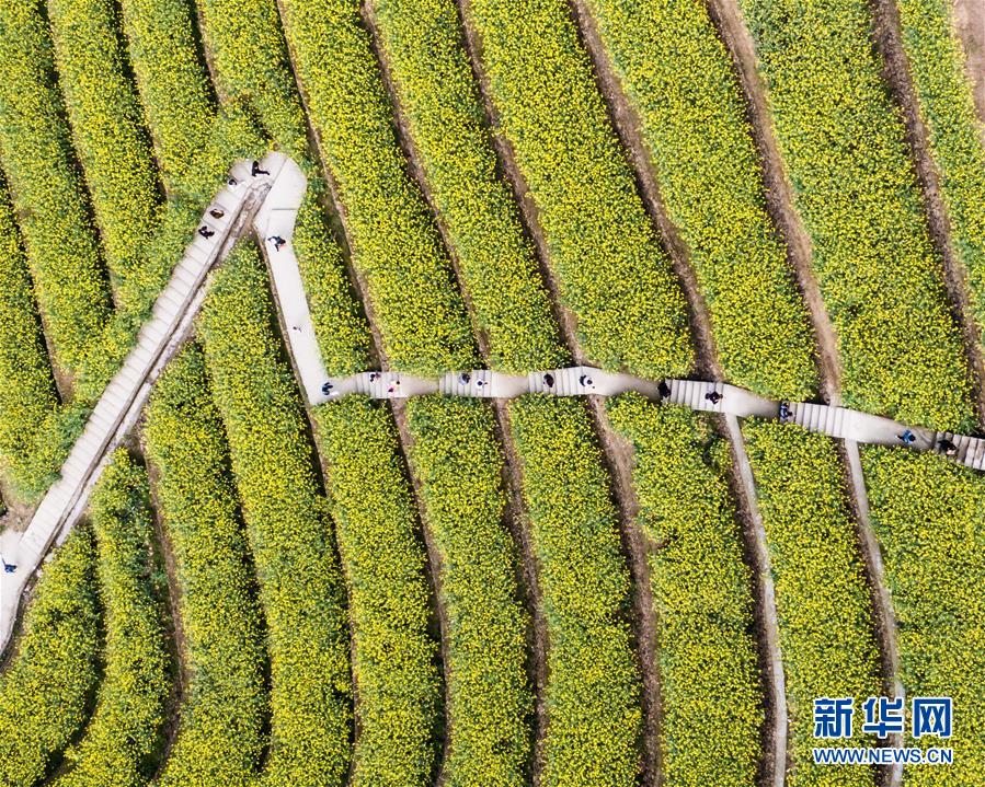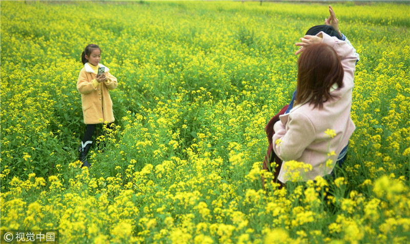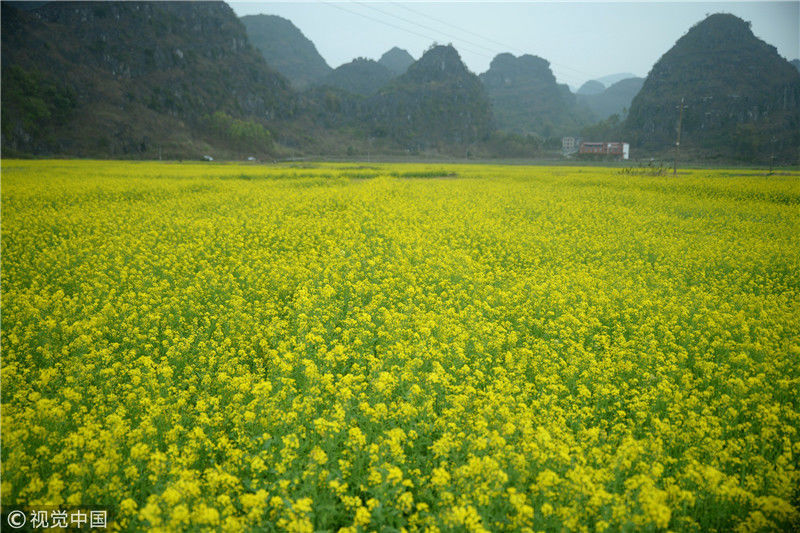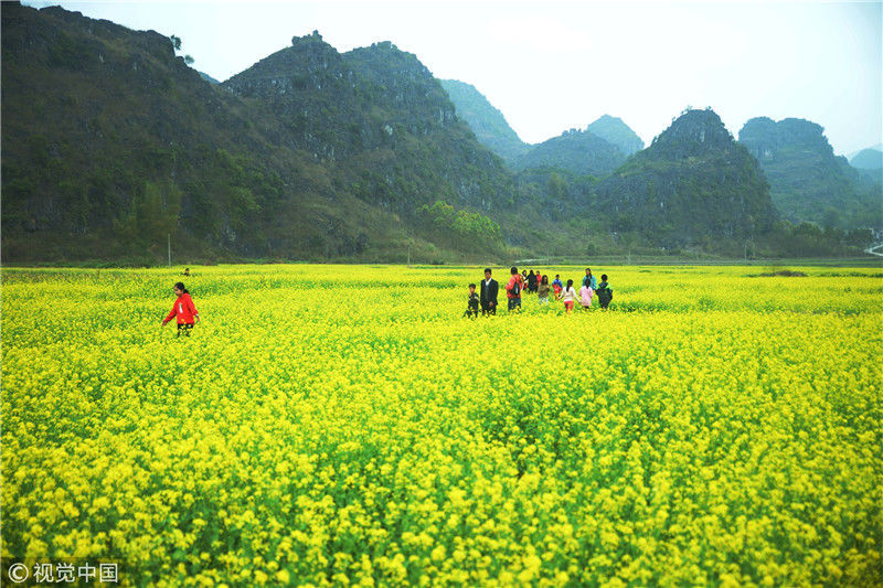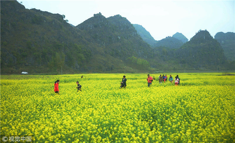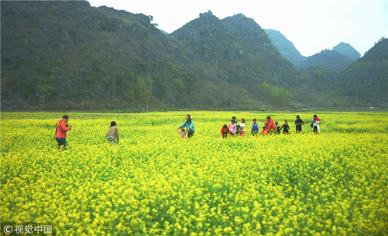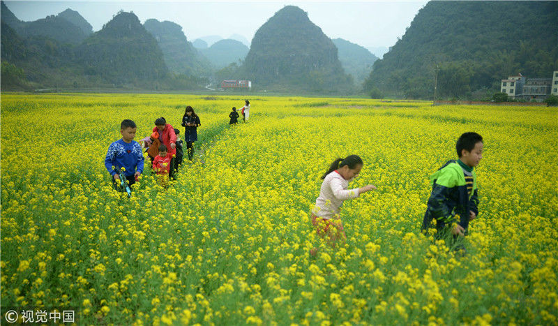 2019年2月5日,春節期間,廣西來賓市忻城縣萬余畝油菜花競相綻放,吸引眾多游客前來賞花游玩,感受春天的氣息。近年來,廣西忻城縣大力實施鄉村振興戰略,注重發展鄉村旅游產業,把鄉村旅游與美麗鄉村、脫貧攻堅緊密結合起來,輻射帶動當地貧困戶脫貧致富。樊紹光/視覺中國