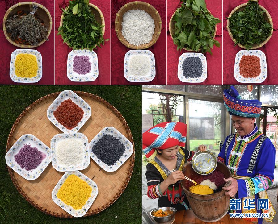 上五圖:4種不同植物及其色素染成的糯米和原色糯米;下左圖:4種不同植物色素染成的糯米和原色糯米;下右圖:在廣西上林縣巷賢鎮,兩名壯族村民在查看一桶剛剛蒸熟的五色糯米飯(拼版圖片,3月25日攝)。每年“壯族三月三”到來之際,廣西的壯族同胞都有蒸制五色糯米飯迎接節日的習俗,以祈禱五谷豐登,五福臨門。這些五色糯米飯,主要采用天然植物萃取色素,將糯米分別浸泡到紫、黃、紅、黑4種不同植物色素的水里,充分染色后,與原色糯米一起蒸熟而成。色澤鮮艷、清香誘人的五色糯米飯,是“壯族三月三”接待來客時必不可少的傳統美食。新華社記者陸波岸攝