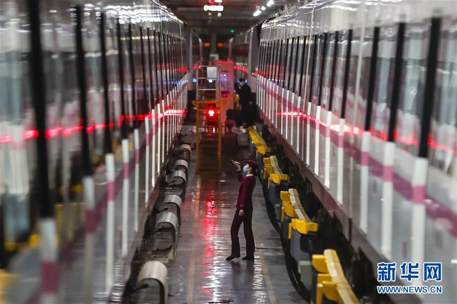 3月28日,武漢地鐵運營有限公司司機吳亞在常青車輛段巡視車輛內部情況。新華社記者沈伯韓攝