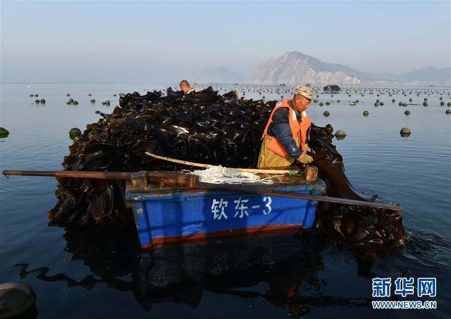 海島居民們在養殖區收割海帶(5月24日攝)。新華社記者朱崢攝