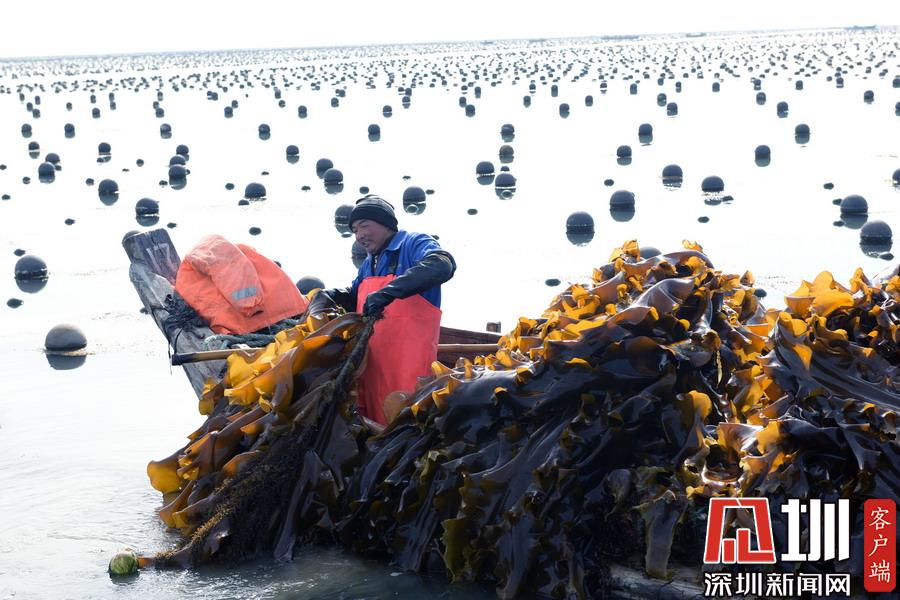 2020年3月29日,山東威海,榮成市愛連灣海水養殖區域,養殖工人開始收割海帶。