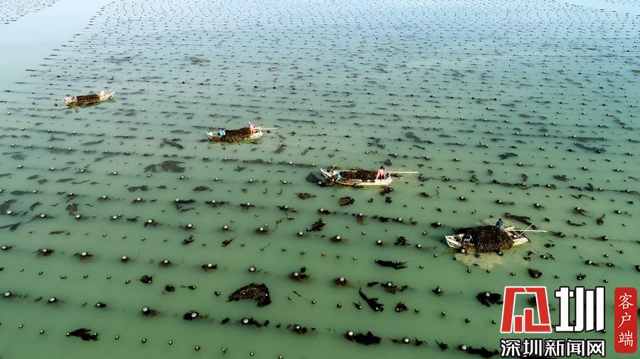 2020年3月29日,山東威海,榮成市愛連灣海水養殖區域,養殖工人開始收割海帶。