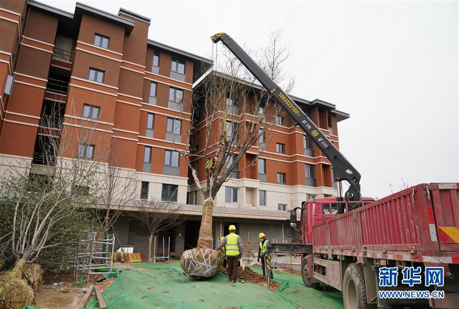 工人在雄安高質量建設實驗區(生活)項目建設現場吊裝樹木(3月26日攝)。新華社記者楊世堯攝