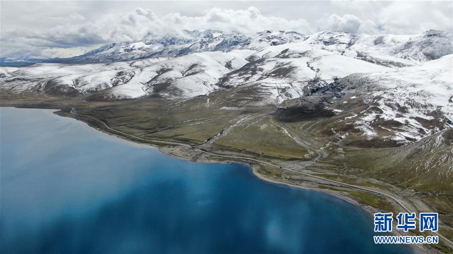 8月31日無人機拍攝的羊卓雍錯及邊上的307省道。新華社記者晉美多吉攝