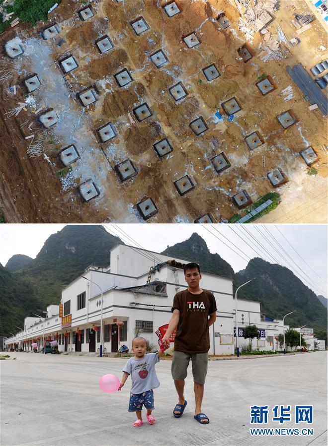 拼版照片:上圖為位于廣西都安瑤族自治縣大興鎮的正在施工建設的敢皓易地扶貧搬遷安置新區(2017年7月26日攝);下圖為居民在廣西都安瑤族自治縣大興鎮敢皓易地扶貧搬遷安置新區散步(2019年10月16日攝)。新華社記者陸波岸攝
