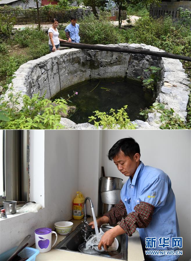拼版照片:上圖為在廣西都安瑤族自治縣下坳鎮加八村龍力屯,袁朝強(右)和妻子羅蘭香站在水井邊(2017年10月12日攝);下圖為在廣西都安瑤族自治縣下坳鎮車家莊扶貧搬遷安置新區,袁朝強在自家新房里使用自來水洗碗(2017年10月12日攝)。新華社記者陸波岸攝