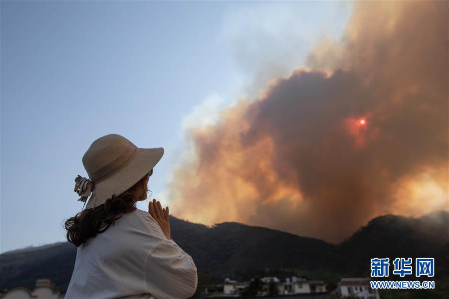 3月31日,一名女士遠望著火災現場祈禱。新華社記者江宏景攝