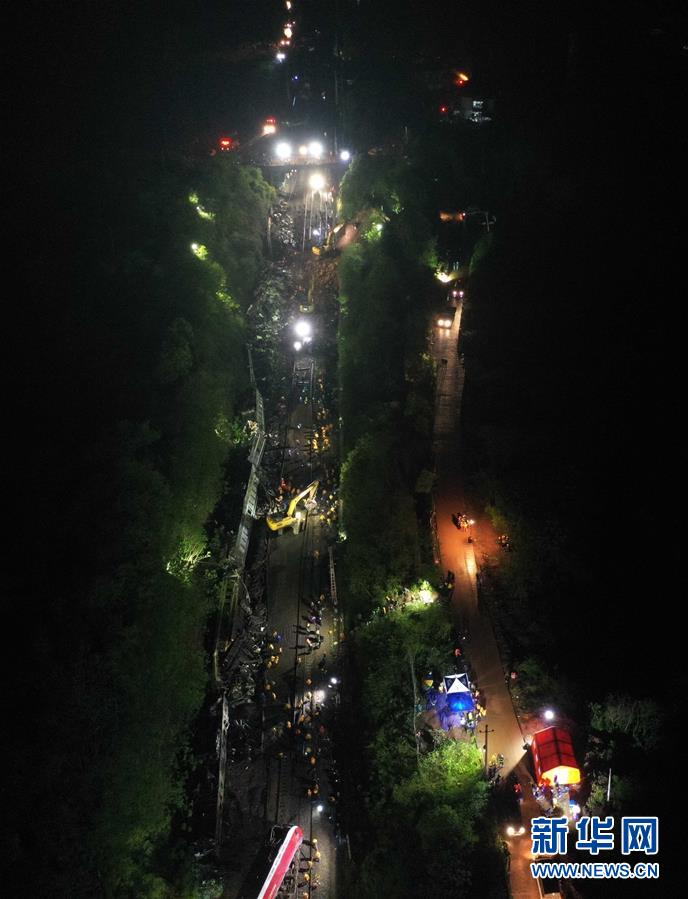 3月30日晚,工程機械在京廣鐵路郴州段脫軌事故現場作業(無人機照片)。新華社記者李尕攝