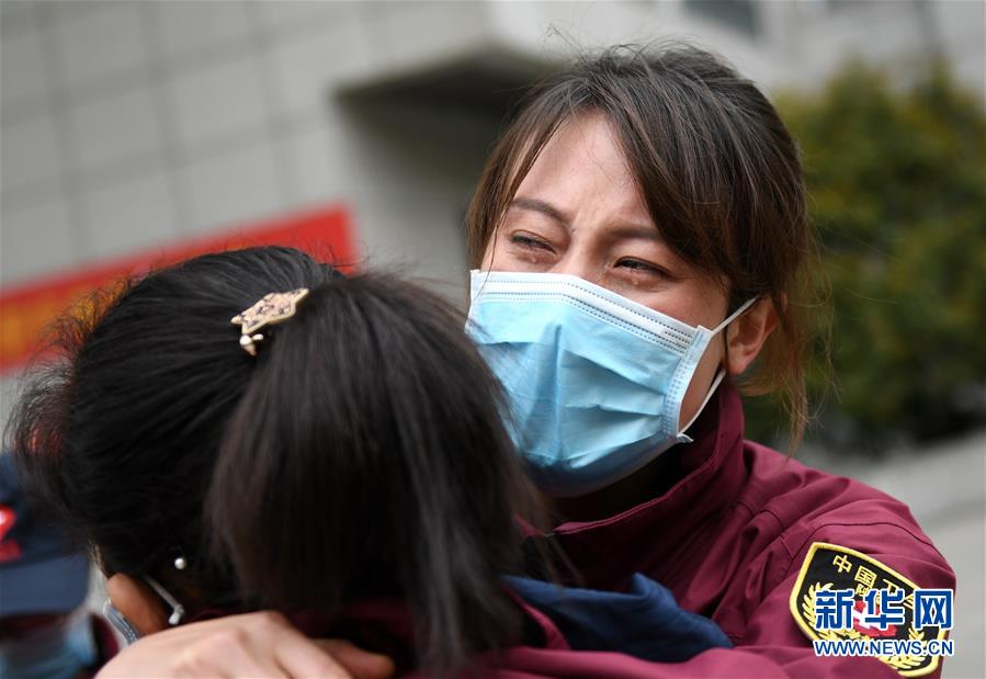 4月3日,來自陜西省榆林市第一醫院的醫療隊隊員王晶晶(右)與“戰友”擁抱時落淚。 當日,陜西省第一批援鄂醫療隊137名隊員在陜西省工人療養院結束了為期兩周的隔離休養。醫療隊員與“戰友”深情作別后,陸續踏上歸途。 新華社記者 李一博 攝