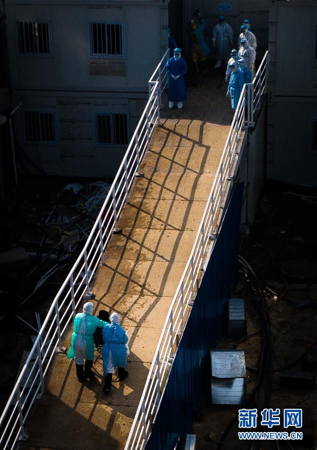 2月4日,醫護人員將患者送入武漢火神山醫院病房(無人機照片)。 新華社記者肖藝九攝