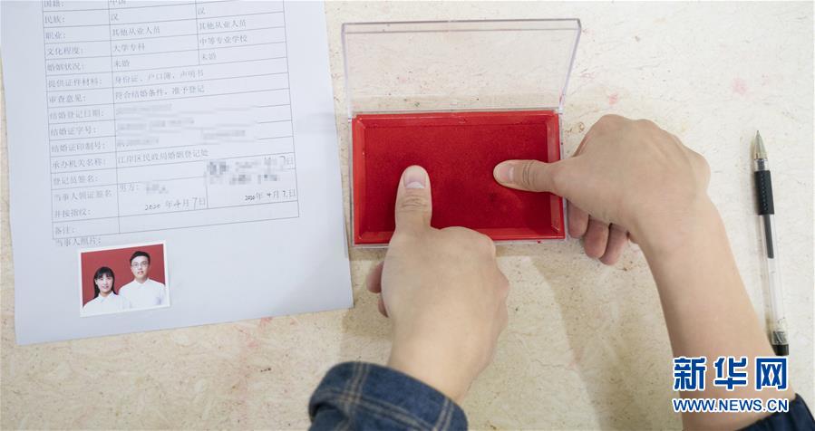 4月7日,在武漢市江岸區民政局婚姻登記處,新人辦理結婚手續時按手印。 新華社記者才揚攝
