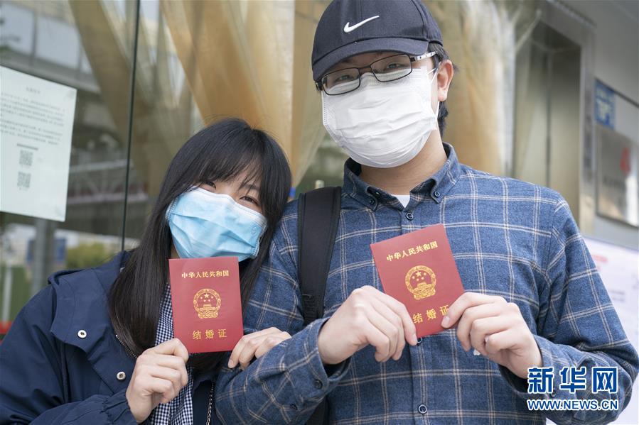 4月7日,在武漢市江岸區民政局婚姻登記處,新人盧先生和丁女士展示結婚證。 新華社記者才揚攝