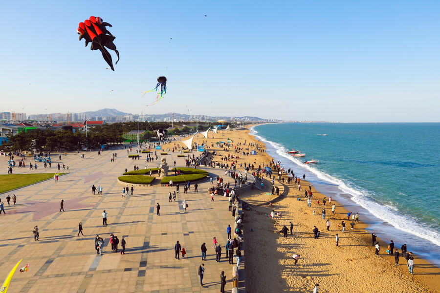 2020年4月5日,在山東日照萬平口景區,游客放飛五彩斑斕的風箏。