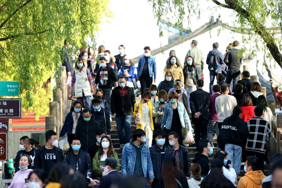 2020年4月5日,上海。清明小長假第二天,上海各景點客流攀升,游客戴口罩有序出游,踏春、防疫兩不誤。在上海千年古鎮七寶老街看到游客川流不息、人頭攢動。古鎮在各入口做好防疫措施、控制客流量。