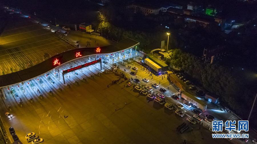4月8日凌晨,車輛通過武漢北高速收費站(無人機(jī)照片)。 新華社記者 肖藝九 攝