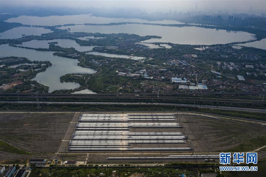 4月7日,在武漢動車段,列車停靠在存車線上(無人機照片)。