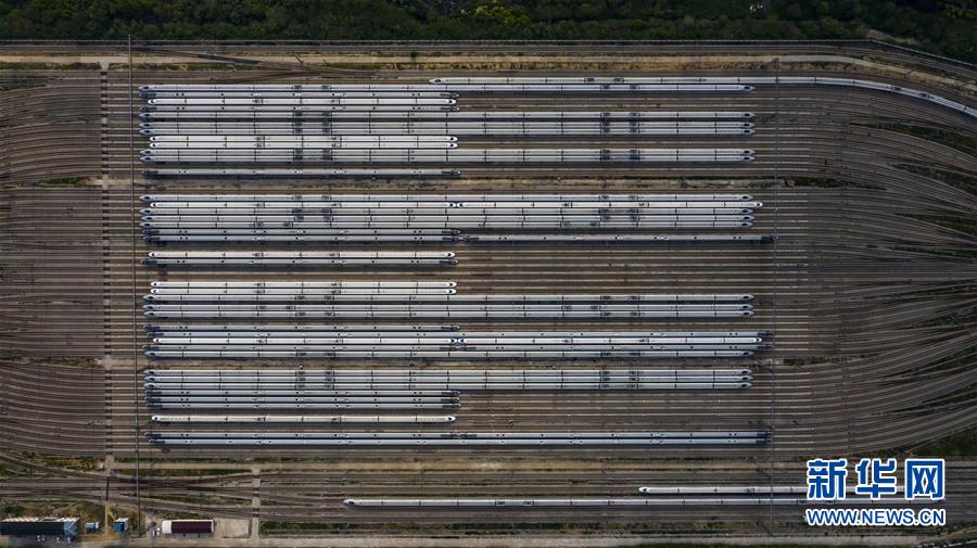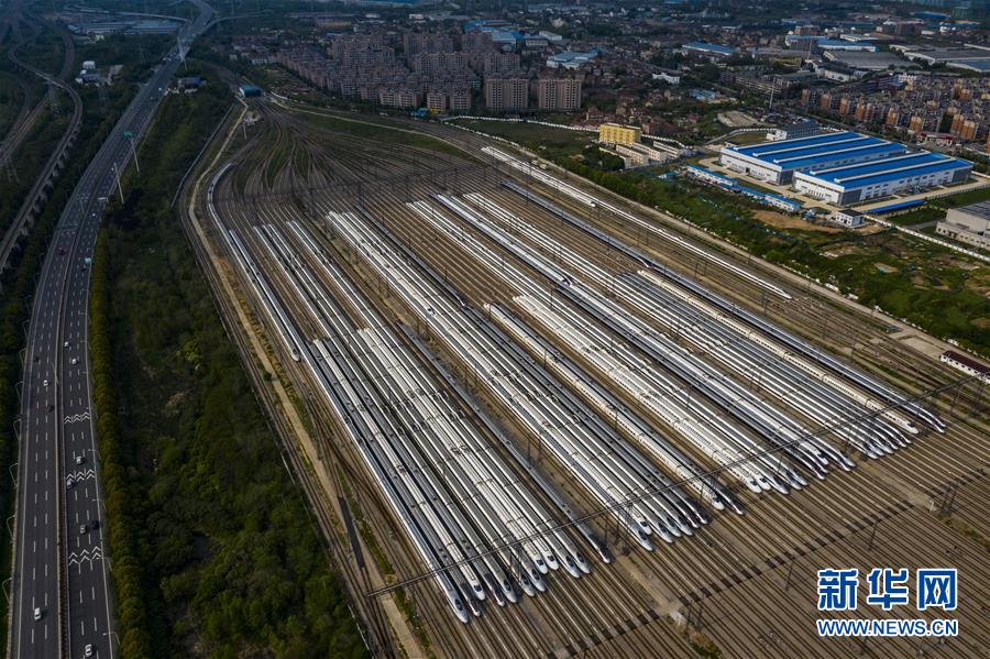 4月7日,在武漢動車段,列車停靠在存車線上(無人機照片)。