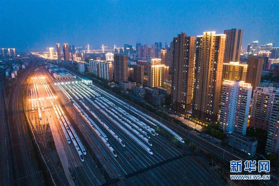 4月7日,在武漢動車段,列車停靠在存車線上(無人機照片)。 新華社記者 肖藝九 攝