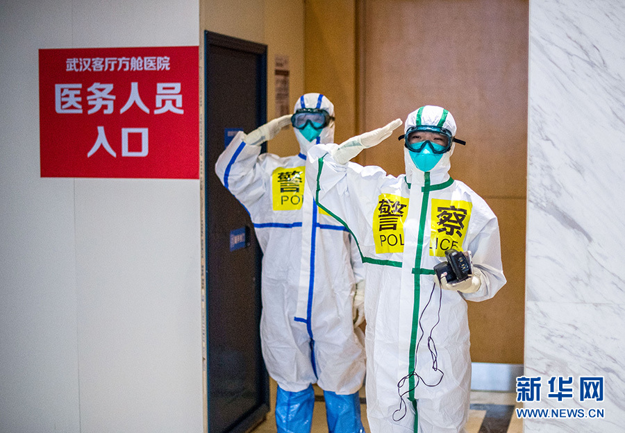 2月25日,在武漢客廳方艙醫院,來自武漢市東西湖區公安分局的民警張錦星(右)與同事劉晨在進方艙前向同事敬禮。 新華社記者 肖藝九 攝