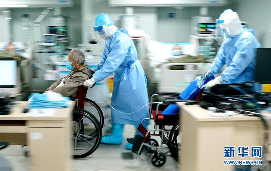 3月20日,武漢火神山醫院重癥醫學一科副主任宋立強(中)護送81歲的新冠肺炎重癥患者去做CT檢查。為確保患者有充足供氧,醫生胡世頡推著氧氣瓶隨行。 新華社記者 王毓國 攝